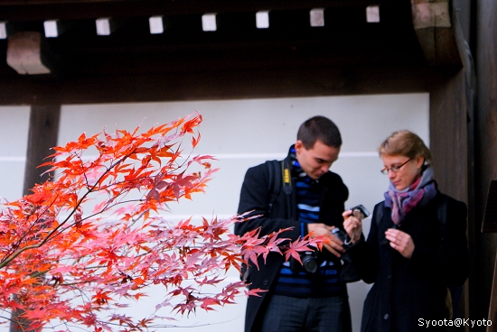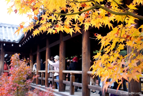東福寺的楓紅美景以通天橋最為著名,是京都首屈一指的賞楓名所,下面這張照片就是從臥雲橋拍通天橋的景致,如此著名的賞楓名所人潮自然不少,在臥雲橋上要靠近通天橋那一側的橋邊還真是不簡單,好不容易等到空檔靠近橋邊拍了照片就趕快離開,不然就會被人群包圍住了,呵…