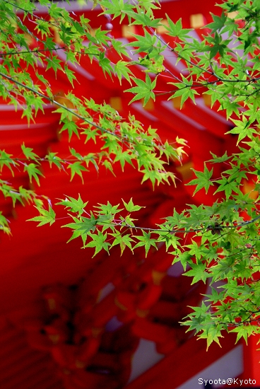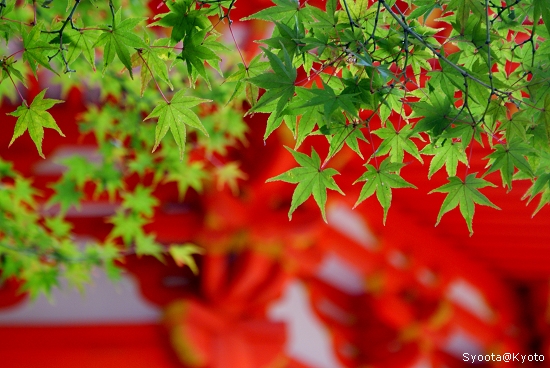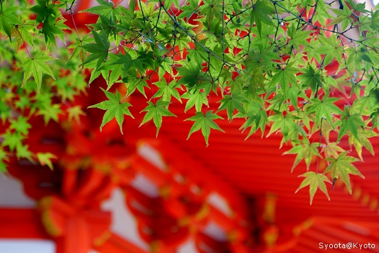 看多了鮮艷的楓紅,反而覺得翠綠的楓葉配上朱紅色的神社更加搶眼,這算是萬紅叢中一點綠吧!呵…