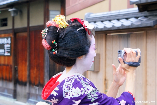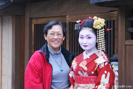 同行的另外一位有點像是媽媽,正拿著攝影機幫女兒記錄變身藝伎的美麗回憶,話說遇到這對變身藝伎母女檔之前,我們在巽橋上遇到了兩位身穿和服(沒化藝伎妝)的小姐,團員們興奮的上前請求合照,一個接一個,拍到那兩位小姐不知是臉笑僵了還是有點不悅了,臉上的笑容似乎有點勉強,呵…所以不管是想找和服妹妹、變身藝伎或真的藝伎拍照,一定都要有禮貌的詢問對方的意願,並且記得適可而止哦!呵…