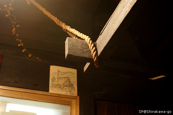 餐廳裡有個地爐,不過這裡不是直接在地爐上燒炭,而是把炭火放在金屬製的烤爐裡,爐子上可以煮水,爐子連接的管子把熱氣導引到天花板上,可能是藉此可以溫暖整棟合掌屋吧!